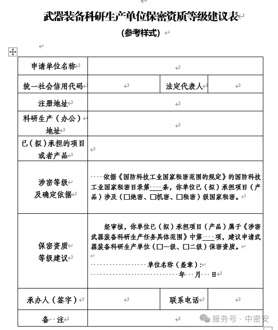 附:武器装备科研生产单位保密资质等级建议表(参考样式)